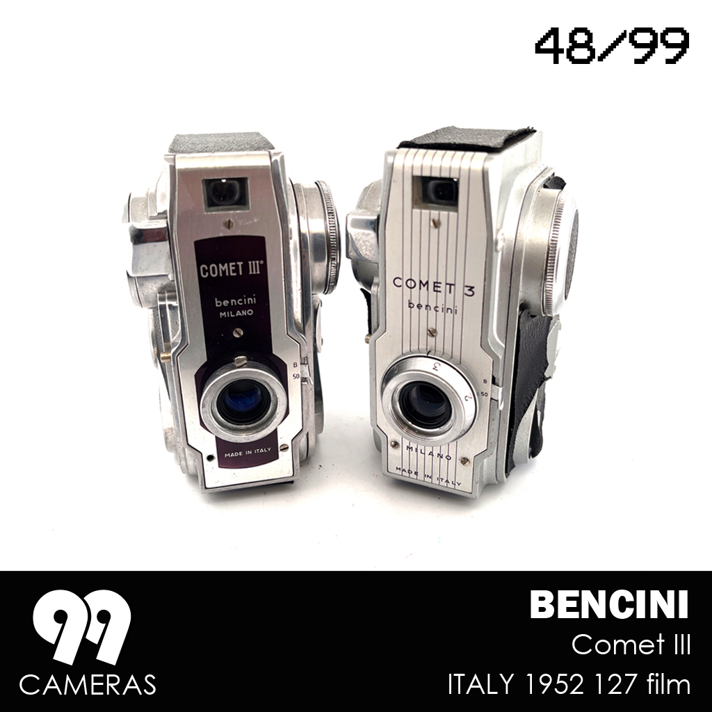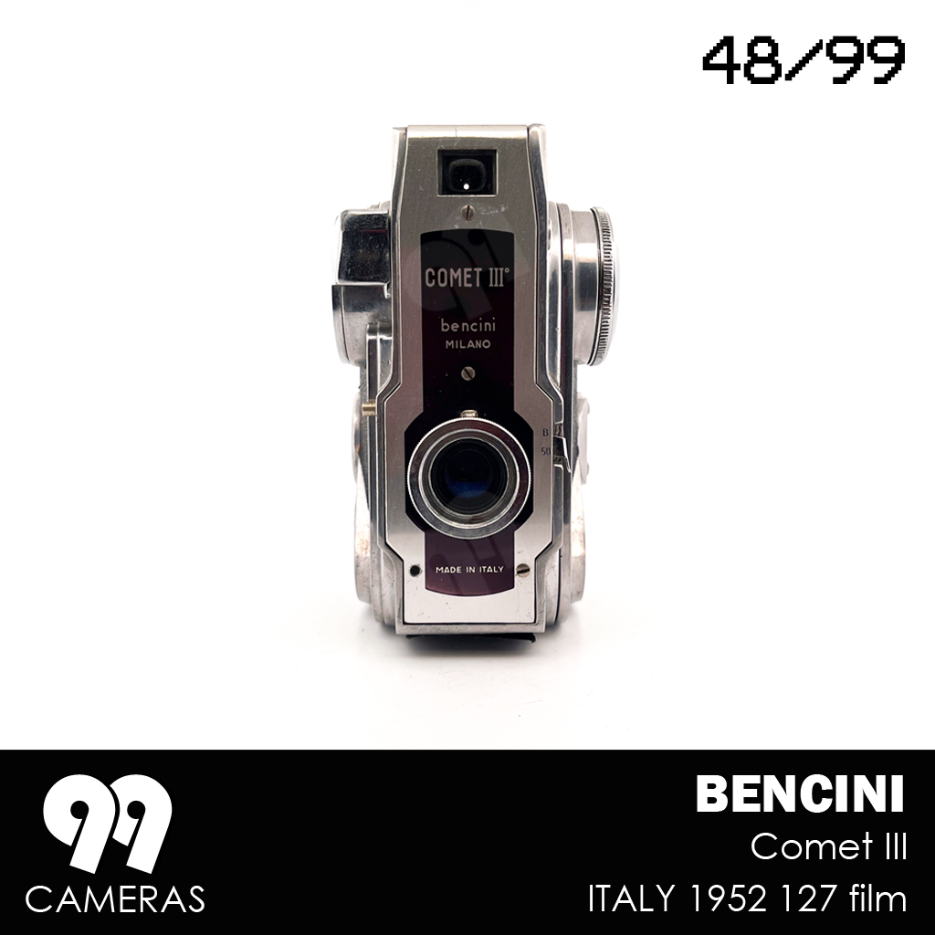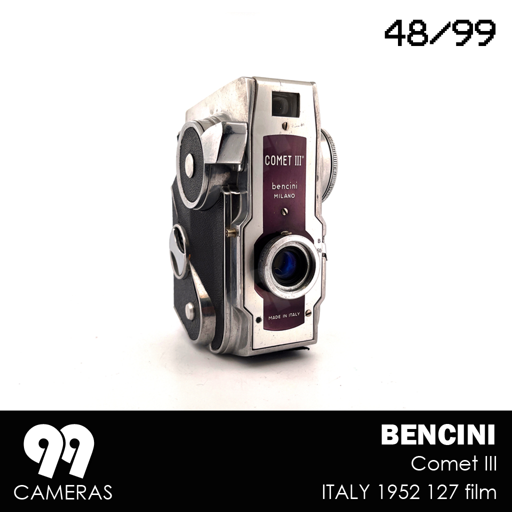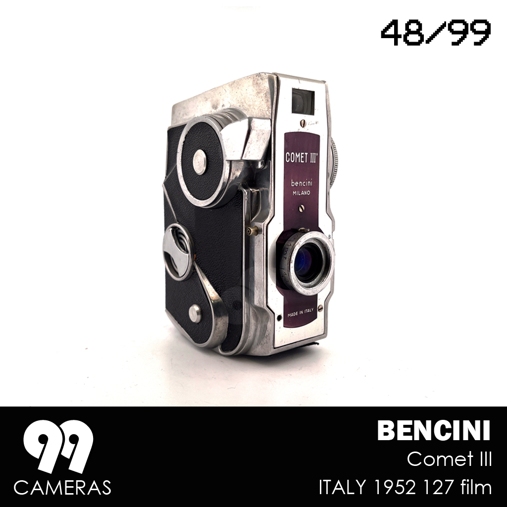Surprisingly, for about a year, Bencini tried a completely different design (for an otherwise pretty basic camera). The Comet III is an elegant, vertical, futuristic-looking device with an over-sized winding knob and beautiful art-deco character. The design is immediately recognizable and is often presented as a great example of Italian design from the 50s. During that Period 3 variations of the camera were produced, mainly changing the lens and the front cover. After that Bencini went back to more classic (and boring) design.