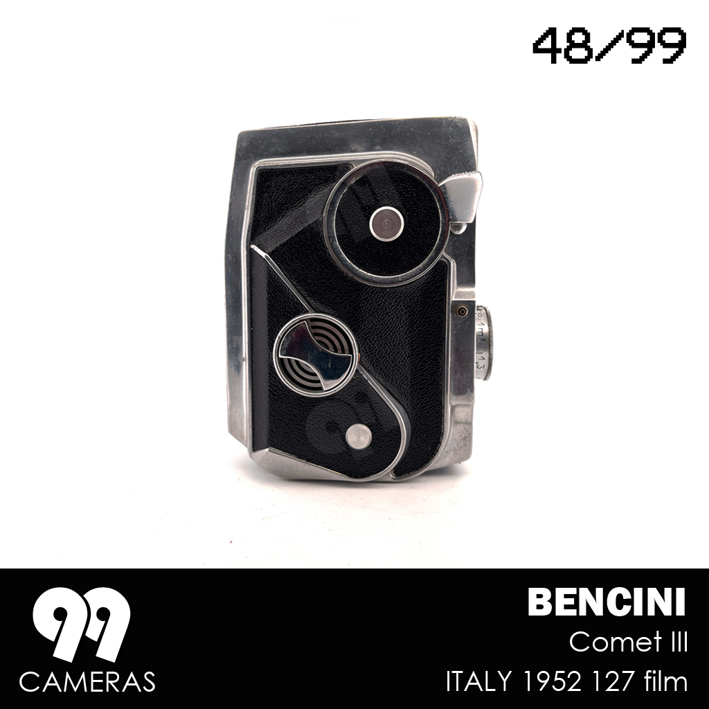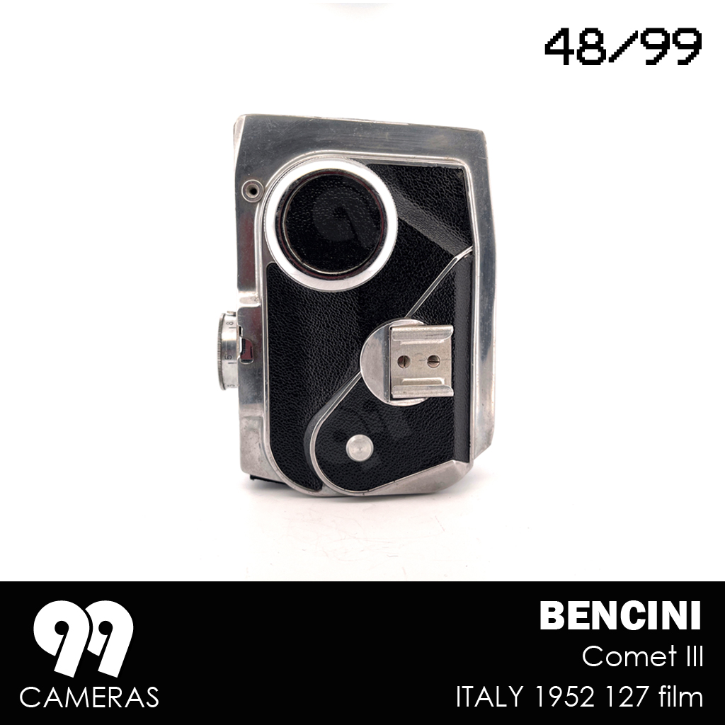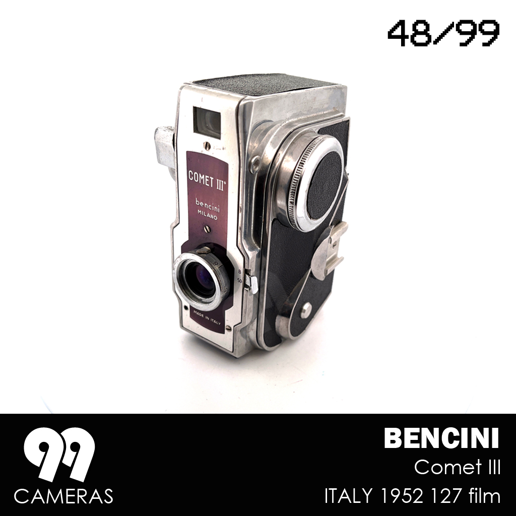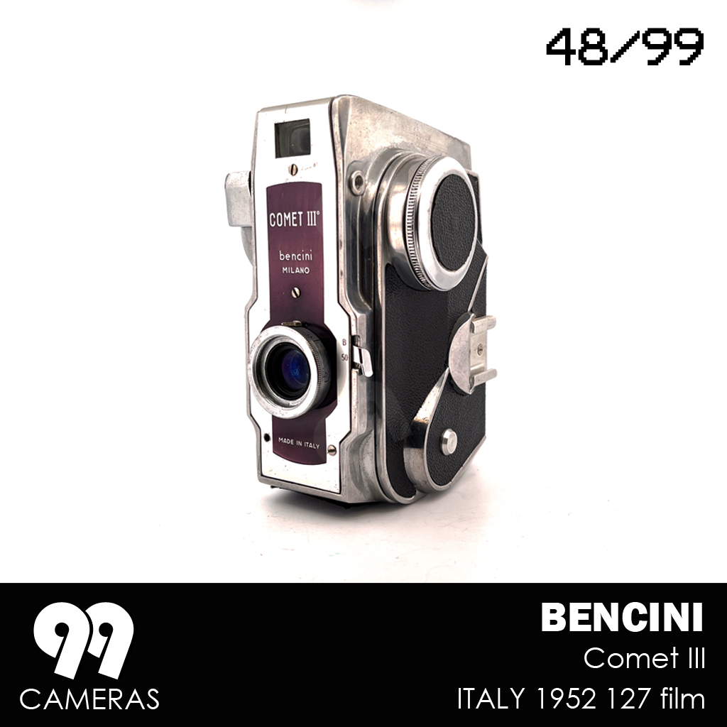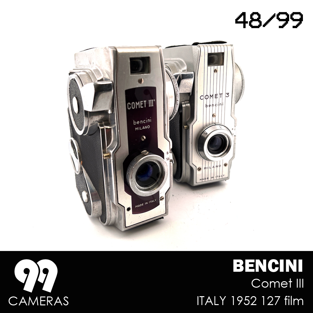 Surprisingly, for about a year, Bencini tried a completely different design (for an otherwise pretty basic camera). The Comet III is an elegant, vertical, futuristic-looking device with an over-sized winding knob and beautiful art-deco character. The design is immediately recognizable and is often presented as a great example of Italian design from the 50s. During that Period 3 variations of the camera were produced, mainly changing the lens and the front cover. After that Bencini went back to more classic (and boring) design.