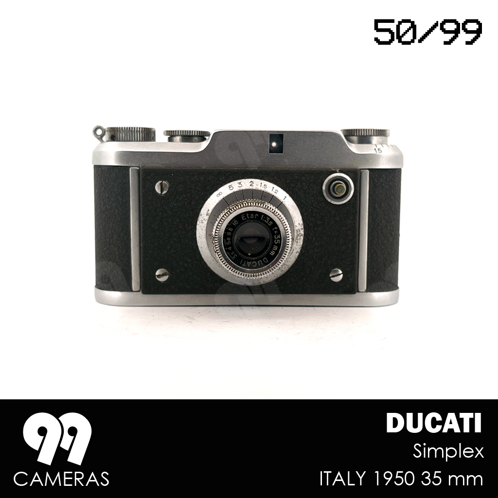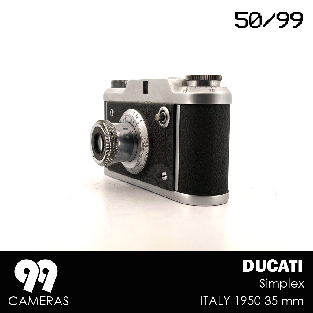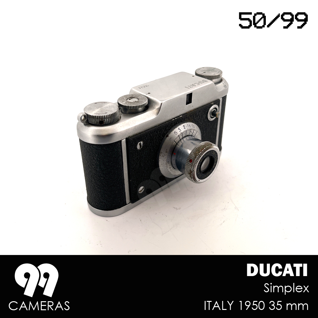 The Ducati Simplex came out alongside the Sogno in 1950, as a simplified version (fixed lens, no rangefinder), but with the same exceptionally compact design and a very distinctive Italian look. The goal was to reach a broader and less technical audience. Unfortunately the Simplex was only produced in a few thousand copies in 1950 because Ducati stopped its photographic production to concentrate on the more profitable sector of motorcycles.