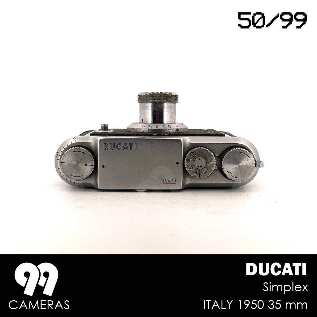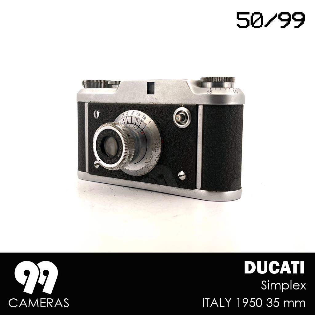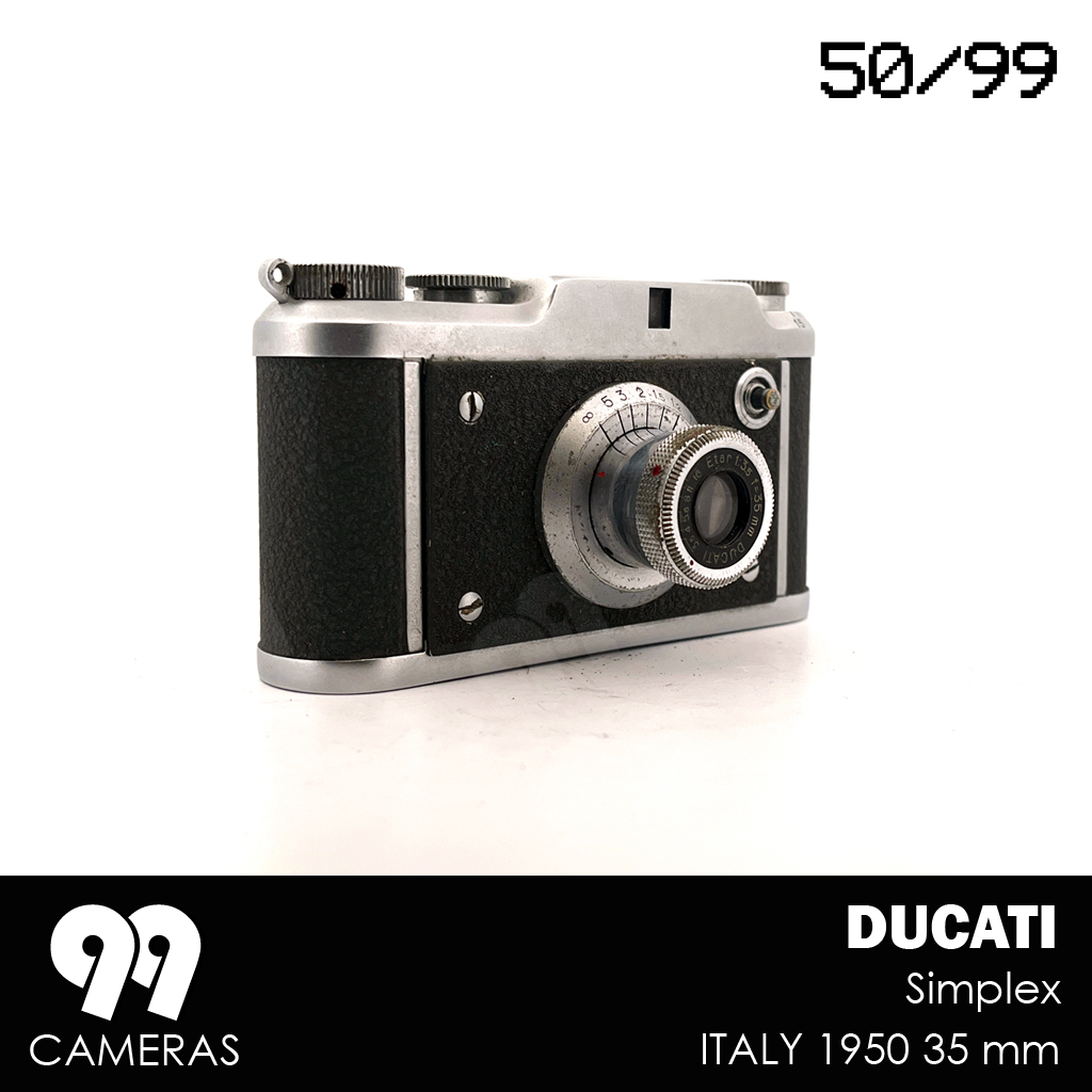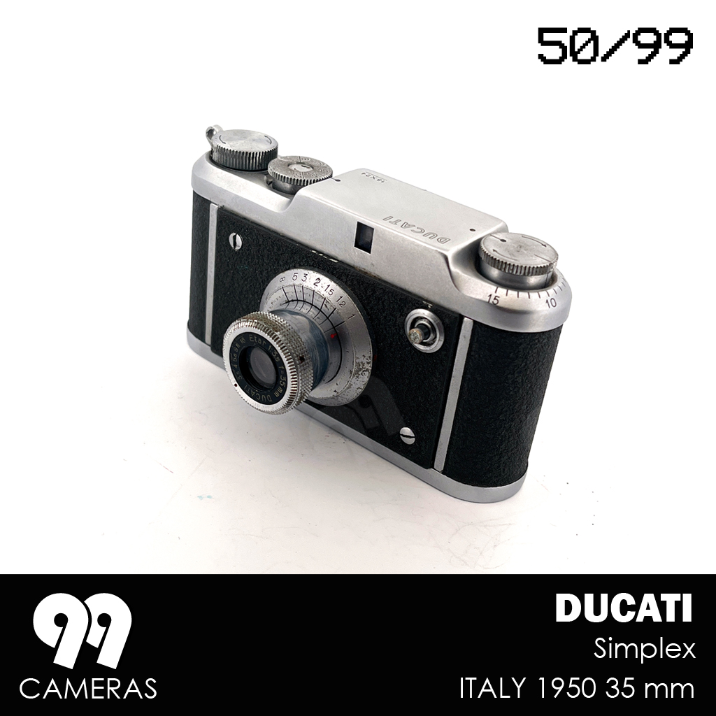 The Ducati Simplex came out alongside the Sogno in 1950, as a simplified version (fixed lens, no rangefinder), but with the same exceptionally compact design and a very distinctive Italian look. The goal was to reach a broader and less technical audience. Unfortunately the Simplex was only produced in a few thousand copies in 1950 because Ducati stopped its photographic production to concentrate on the more profitable sector of motorcycles.